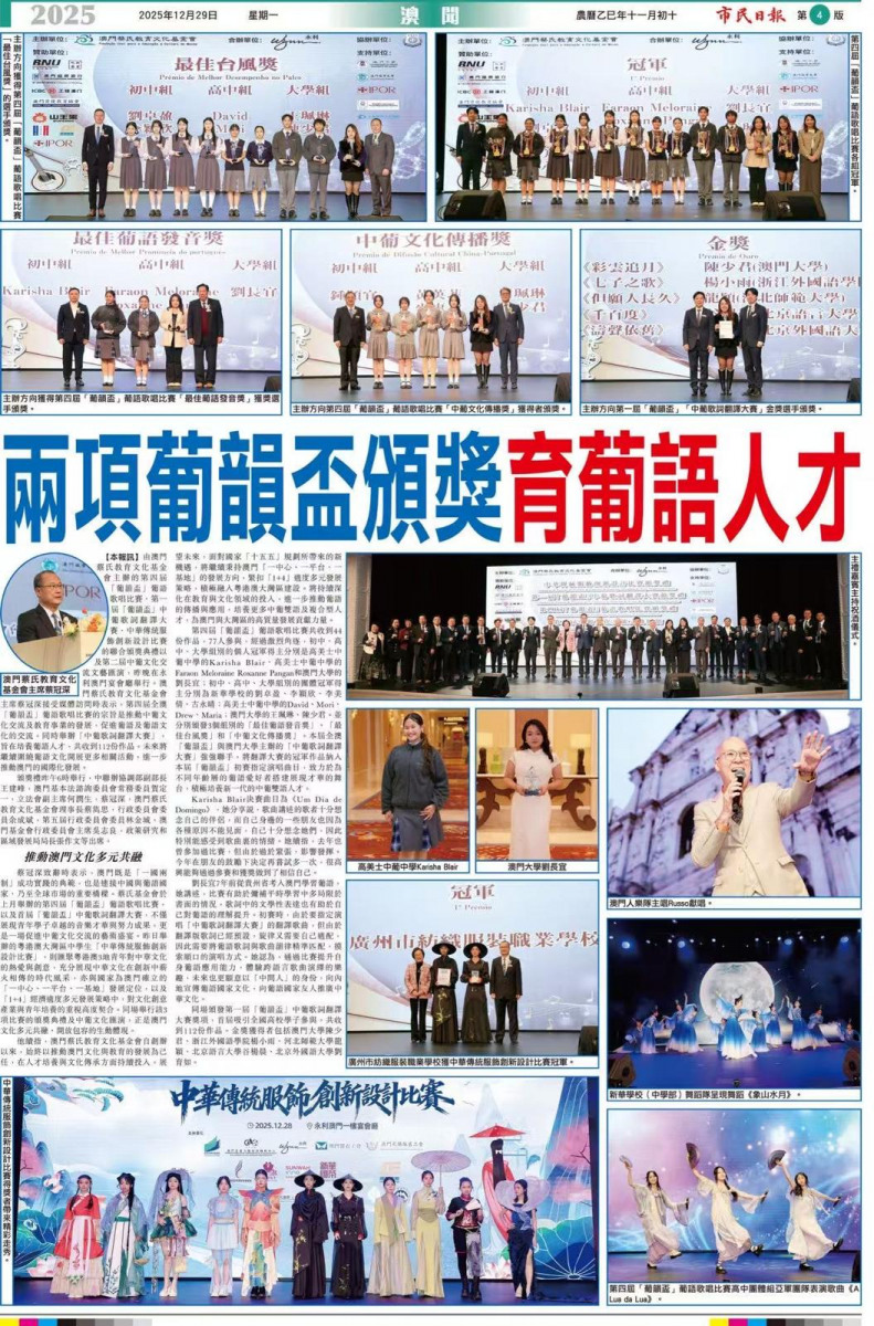On 29 December, the Chinese Traditional Costume Innovation Design Competition, organised by the Macau Choi Educational and Cultural Foundation, took place in Macau. The competition received a total of 232 design submissions from 116 teams across the Greater Bay Area, with 22 works ultimately making it to the finals. Students from our school performed exceptionally well and secured the Second Runner-up position in the competition.
